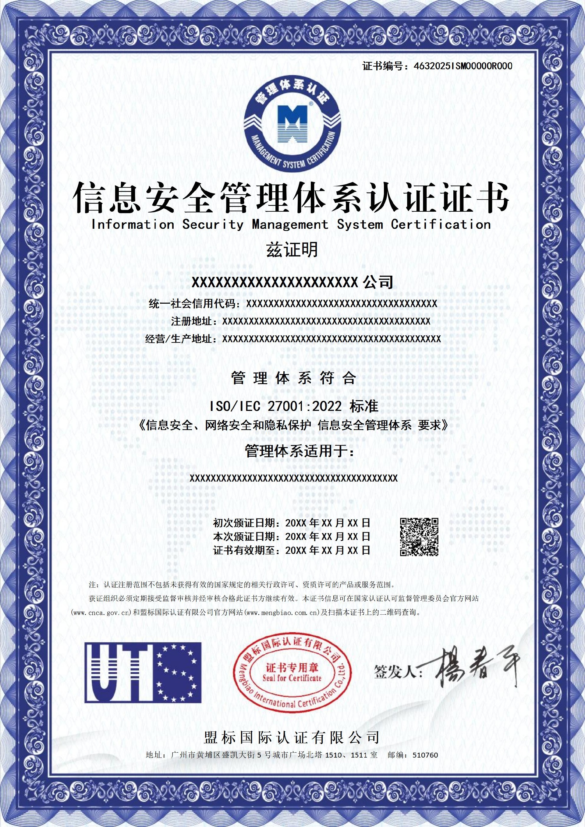 信息安全管理體系認(rèn)證證書-樣版