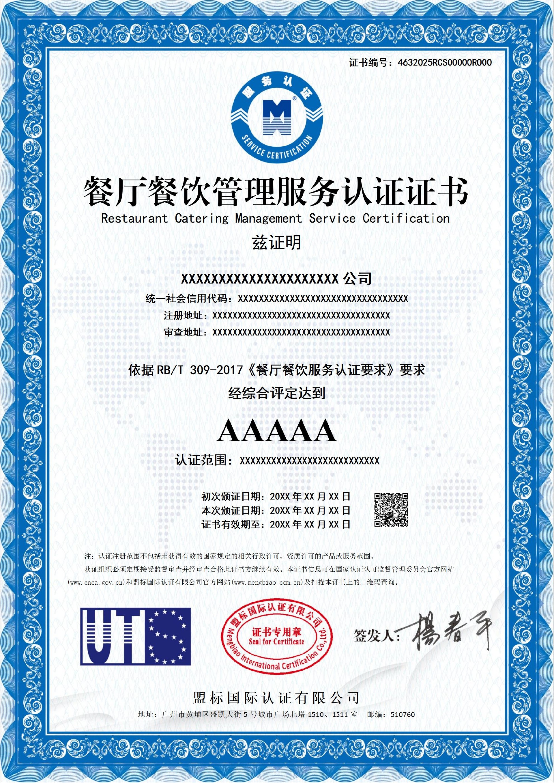 餐廳餐飲管理服務(wù)認(rèn)證證書(shū)(RCS)-樣版