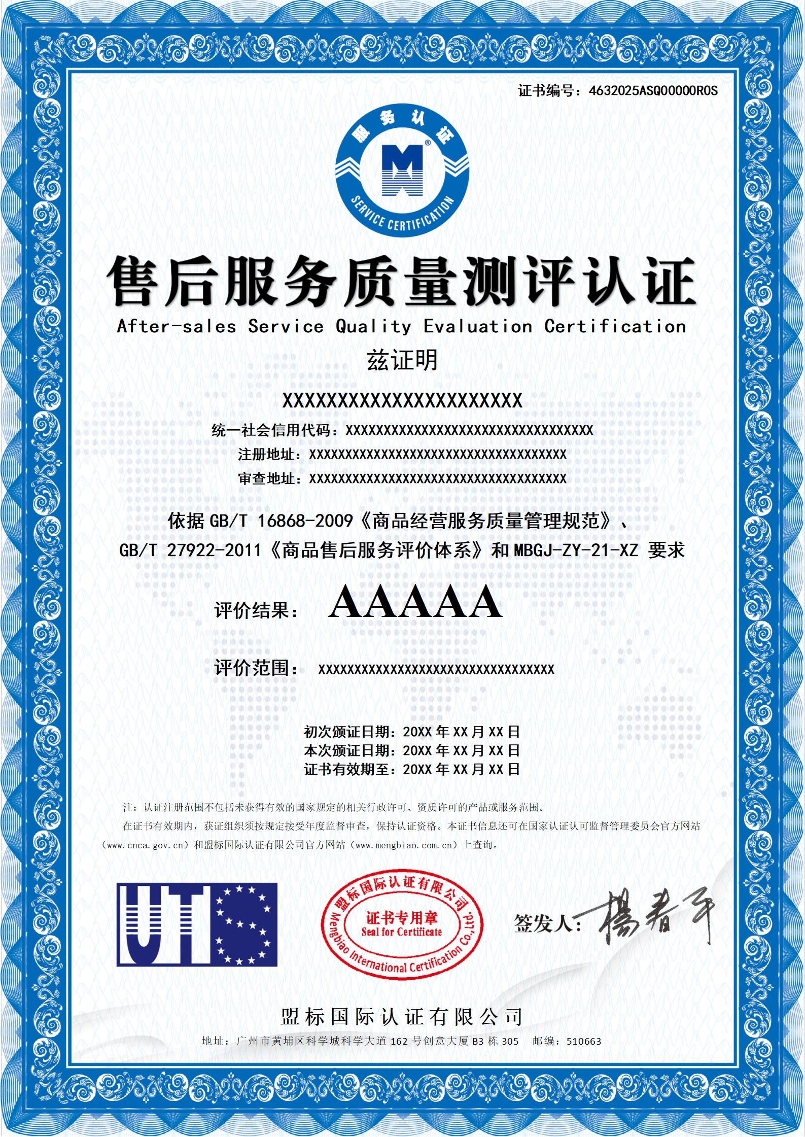 售后服務(wù)質(zhì)量測(cè)評(píng)認(rèn)證證書(shū)-樣版