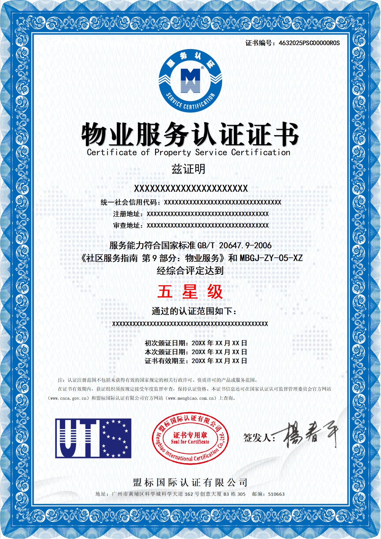 物業(yè)服務(wù)認(rèn)證證書(shū)-樣版