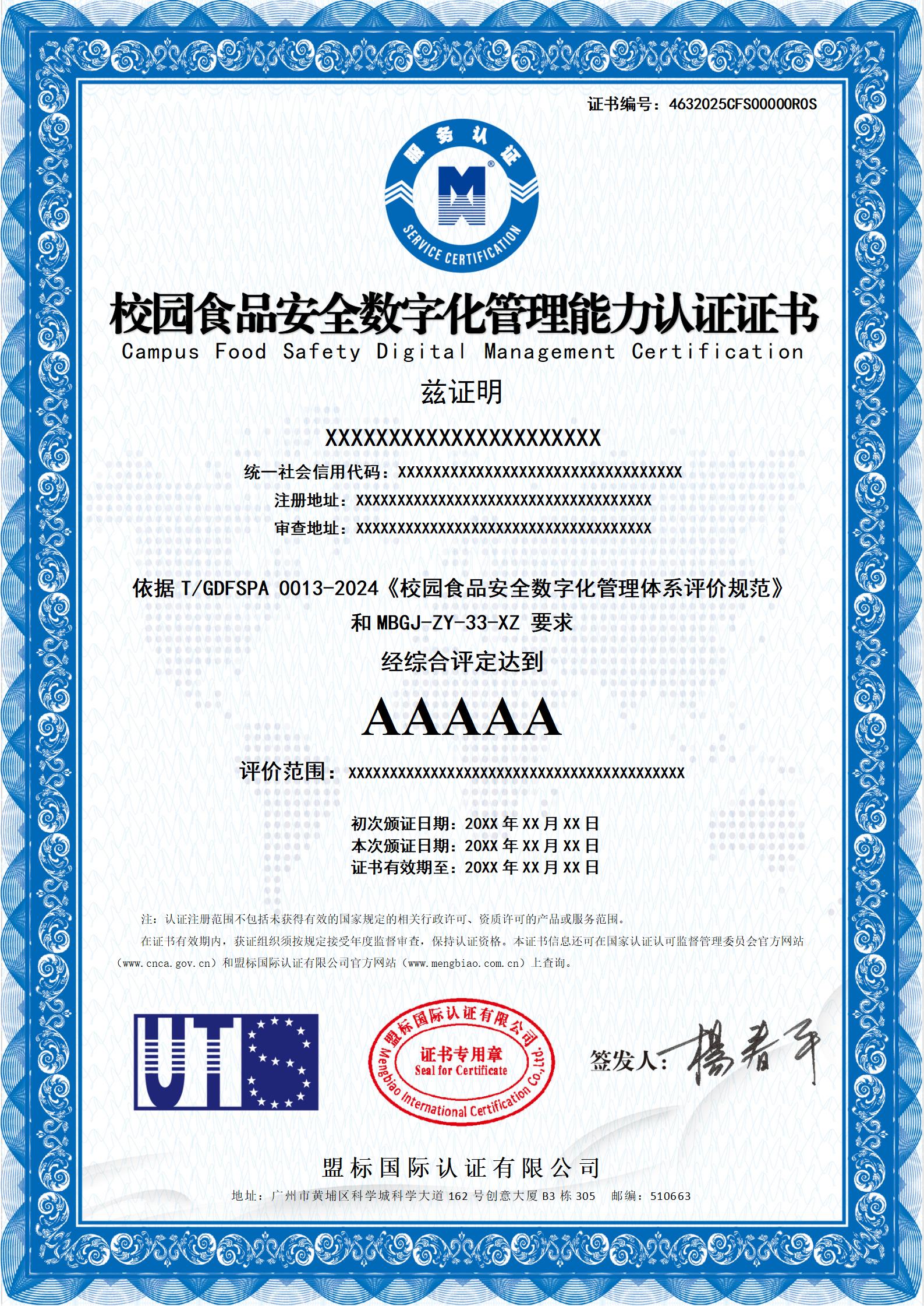 校園食品安全數(shù)字化管理能力認(rèn)證證書(shū)-樣版