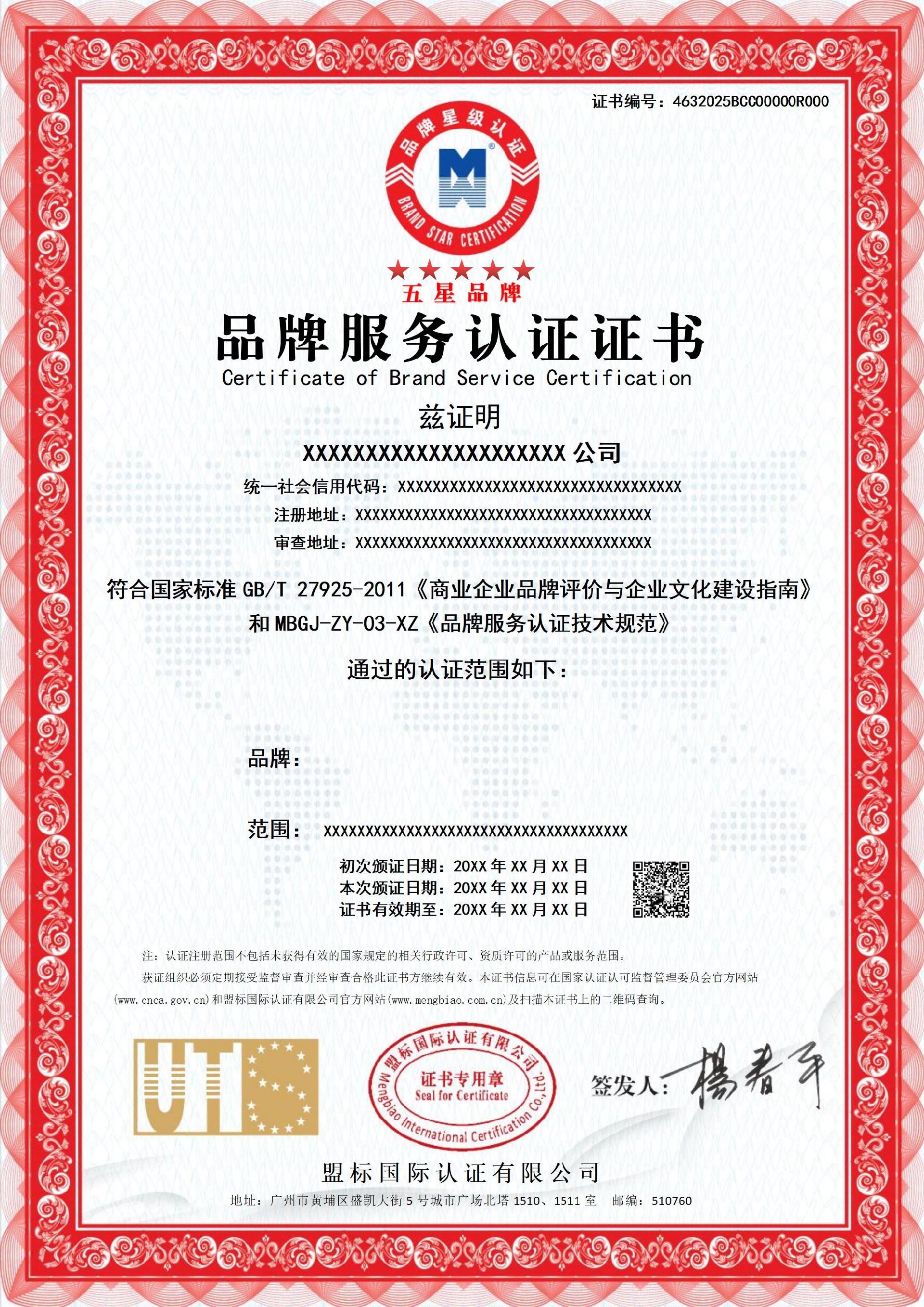 品牌服務(wù)認(rèn)證證書(shū)-樣版