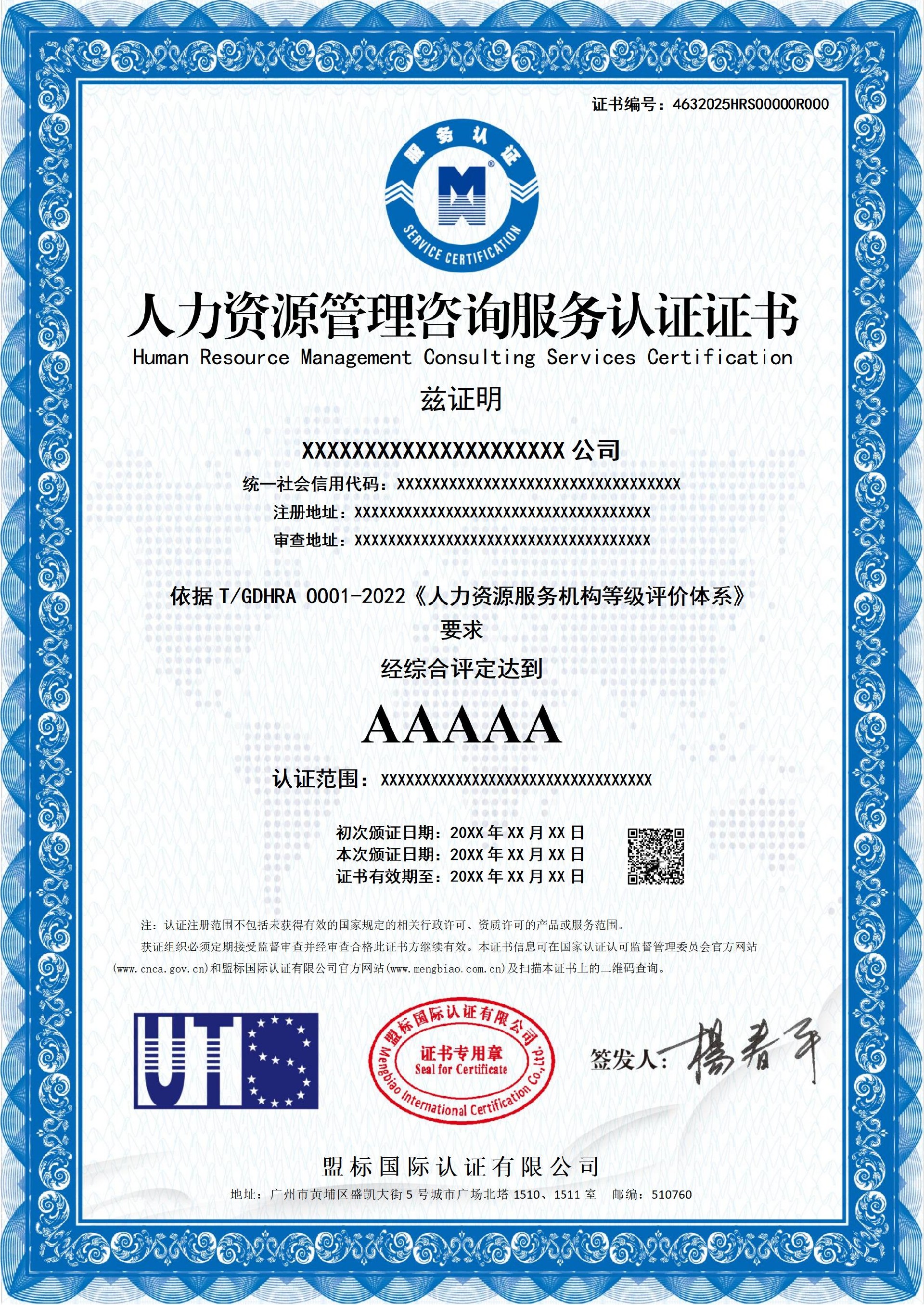 人力資源管理咨詢服務(wù)認(rèn)證證書-樣版